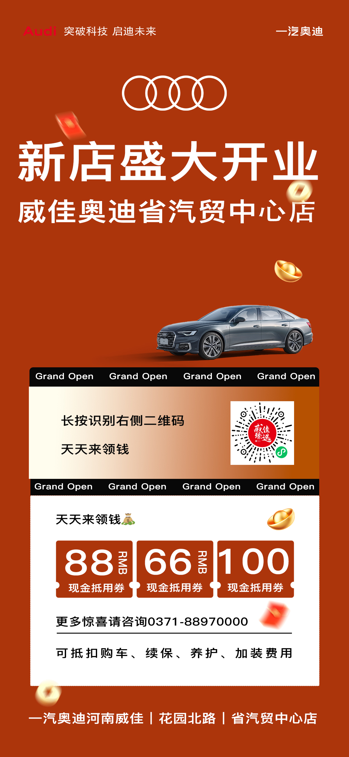 【新店开业 】郑州奥迪省汽贸店 天天来领钱